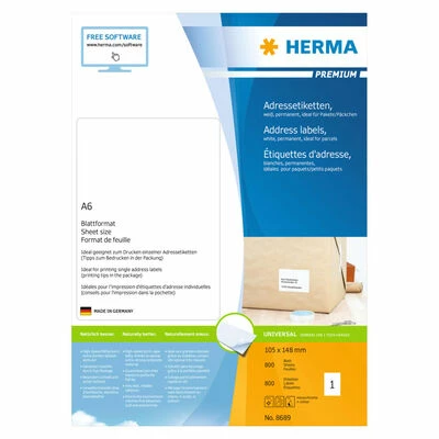 Imprimez vos étiquettes personnalisées avec ces étiquettes d’adresse permanentes conçues par HERMA. Ces étiquettes autocollantes mesurant 105×148 mm sur feuilles A6 sont disponibles en ensembles de 800 feuilles par paquet et 800 étiquettes par paquet. Elles sont épaisses, résistantes, faciles à coller et assurent une adhérence permanente.