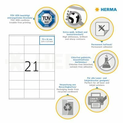 Imprimez vos propres étiquettes personnalisées avec les étiquettes permanentes PREMIUM développées par la marque HERMA. Ces étiquettes autocollantes mesurant 70×41 mm sur feuilles A4 sont livrées par lot de 100 feuilles par paquet, 2100 étiquettes par paquet. Elles sont épaisses, résistantes, faciles à coller et assurent une adhérence permanente. Vous pouvez utiliser les étiquettes universelles au bureau, pour des projets domestiques ou à des fins commerciales.