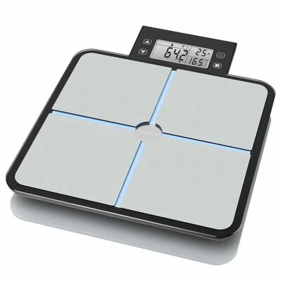 Cet appareil vous permet de mesurer le poids corporel, l’indice de masse corporelle (IMC), l’utilisation calorique par jour, la graisse corporelle, la masse osseuse et la masse musculaire. Le pèse-personne est équipé d’un affichage amovible, d’un affichage de l’heure, ainsi que d’une fascinante lumière LED bleue. De plus, ce pèse-personne de salle de bain a une capacité de charge particulièrement élevée allant jusqu’à 180 kg.