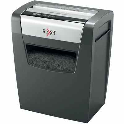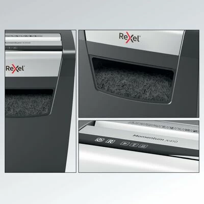 La déchiqueteuse de documents P4 Momentum X410 avec touches de commande tactiles de la marque Rexel est idéale pour couper des documents périmés à la maison ou au bureau.