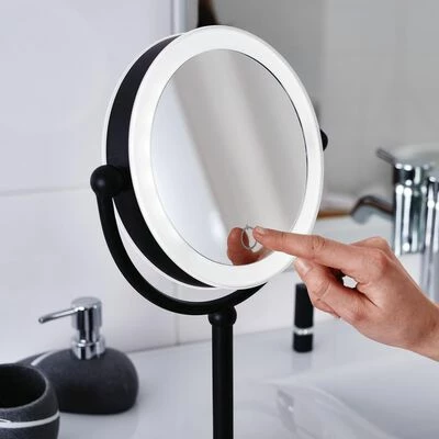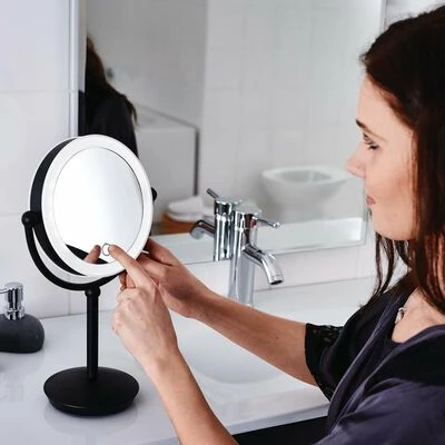 Pour passer d’une vue 1:1 à 5x grossissement, vous pouvez faire pivoter le miroir de 180°. Le miroir de maquillage est équipé d’une lumière LED dimmable afin que vous puissiez vous ajuster à la luminosité souhaitée. Il y a un interrupteur tactile sur la surface du miroir pour l’allumer et l’éteindre et atténuer la lumière. De plus, la lumière s’éteint automatiquement après 10 minutes. Un câble d’alimentation USB est inclus.