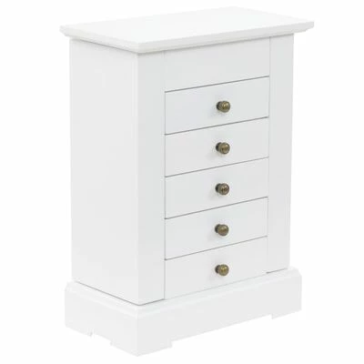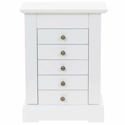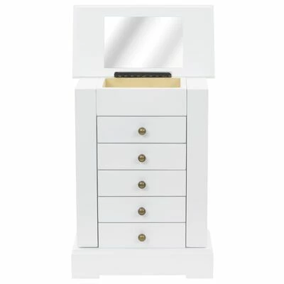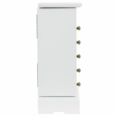 Cette boîte est faite de MDF et dispose d’un miroir en verre. Elle comporte un panneau qui peut être soulevé pour révéler un miroir et un petit compartiment à bijoux. Les deux côtés du meuble peuvent être ouverts et vous pouvez accrocher vos colliers, bracelets ou bracelets de cheville aux crochets. Conçue avec 5 tiroirs, elle offre beaucoup de place pour vos produits cosmétiques, produits capillaires et soins de la peau. Lorsque le miroir n’est pas utilisé, la surface devient alors un endroit idéal pour les petites fournitures.
