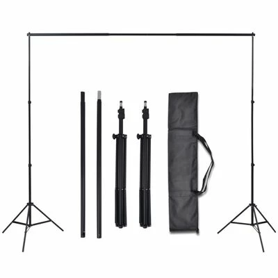 La livraison comprend 2 supports, 2 segments de barre transversale, 3 toiles de fond et 1 sac de transport.